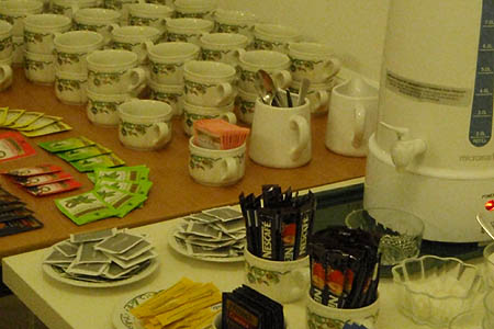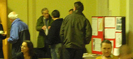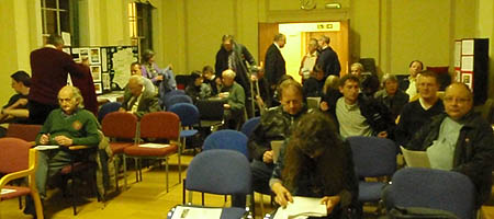 Lisa stayed at home during the meeting - to man any phones, and to take a break after helping with the preps for the meeting (she's a graphic artist who can really make a show look good - thank you). And she asked me if I took any pictures of the full room. As I was in the chair, that would have been an odd thing once we had started, but I did come up with this picture (above or left) to give a flavour. 10 minutes before kickoff, trains still arriving, many people in the coffee room!