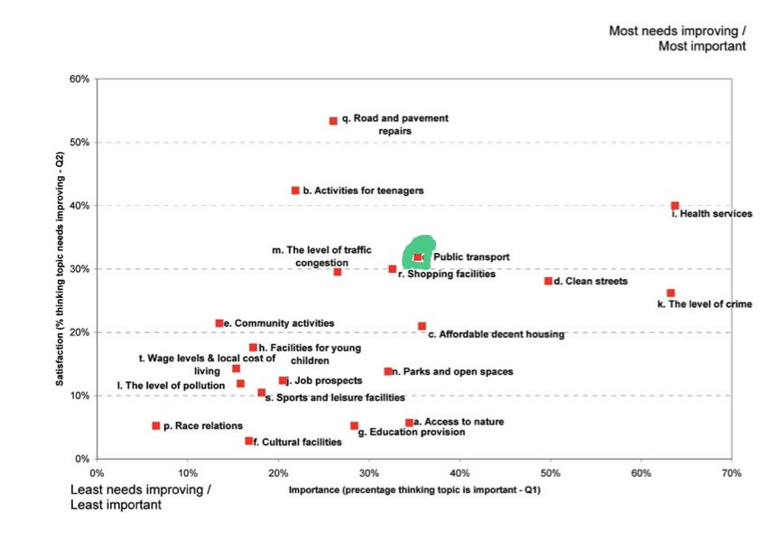"Public Transport" came out 5th out of 20 in terms of importance, and 4th out of 20 in need of improvement. I've added a green highlight to the diagram to show where it is. Only "Health Services" came higher that public transport in both catergories. (click on image to enlarge in another window)