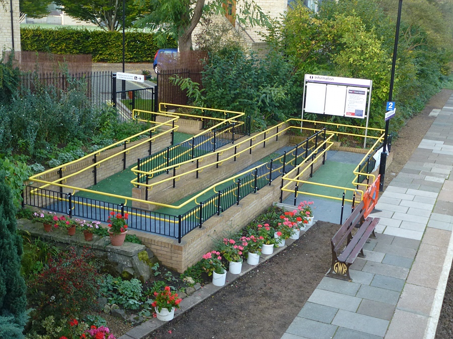 Access to the Bristol-bound platform has only been via the footbridge in the recent past, and this has meant that wheelchair users have been unable to get off the train here from the Westbury direction, or join trains towards Bath Spa. It's also been very difficult for users of prams and pushchairs to fold and lug them over the bridge. This new ramp, running from housing to the rear of the station, should make life very much easier for these people when it's opened - it looks almost ready!