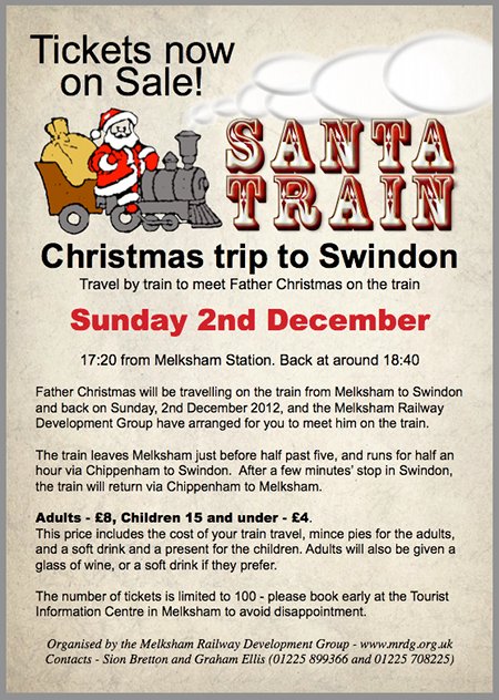 Please prebook at Melksham's Tourist Information Centre - adults £8.00, children £4.00 - and that's inclusive of the rail travel, the Santa experience and the food / soft drink.