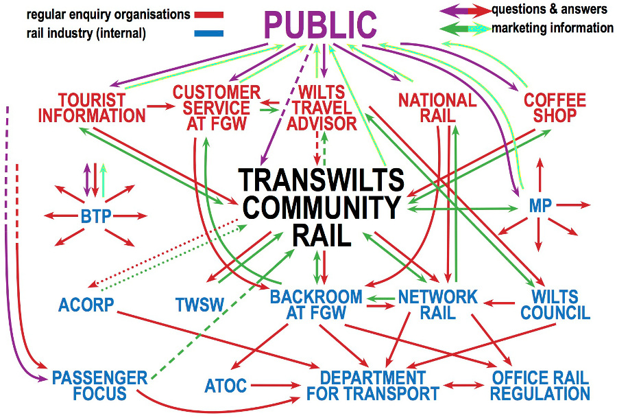 TransWilts Community Rail Partnership - and other rail partnerships - fit in, I have attempted to draw a diagram showing the major organisations and who talks to whom. I've had some help with this, but even then I'm not really sure. Let's have a key: