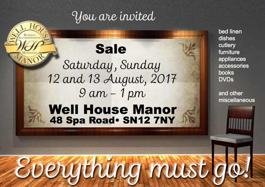 Well House Manor, 12th August 2017 and 13th August 2017. 9 a.m. to 1 p.m. both days. No reasonable offers refused; everything that's there by the sale's gotta go. And that includes both home and accomodation stuff.