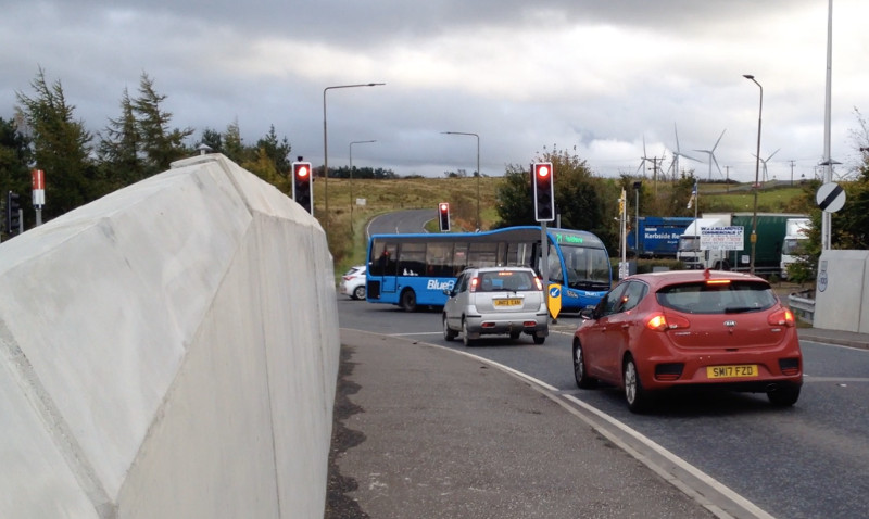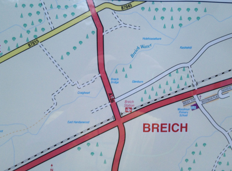 It so happens that I have stopped at Breich many times in the past. It's at the road junction where the trunk A71 east - west artery crossed the A706 - an excellent road from the middle of the lowlands toward the south, which I've driven many times. Busy enough for traffic lights, plenty of turns (4 phases?) and a bit truck sale / rental business on one corner. And into that junction (unsignalled!) comes the unmade track up from the station.